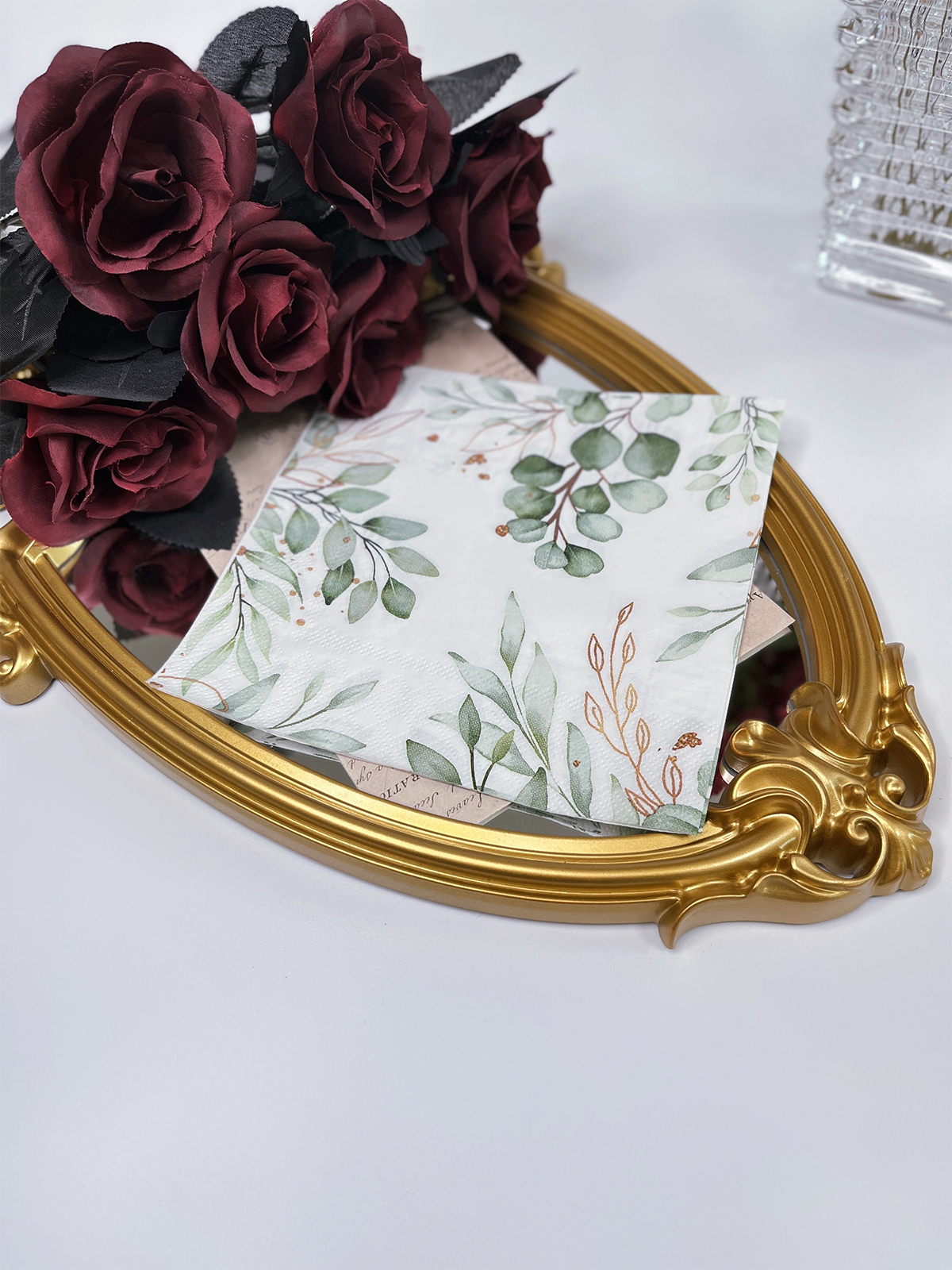 Estas toalhas de hóspedes com folhas verdes de papel de folha de eucalipto são feitas de polpa de madeira virgem 99,99%, macia e altamente absorvente, forte solidez de cor e 2 camadas de papel de alta qualidade, será mais conveniente para você limpar após a festa.