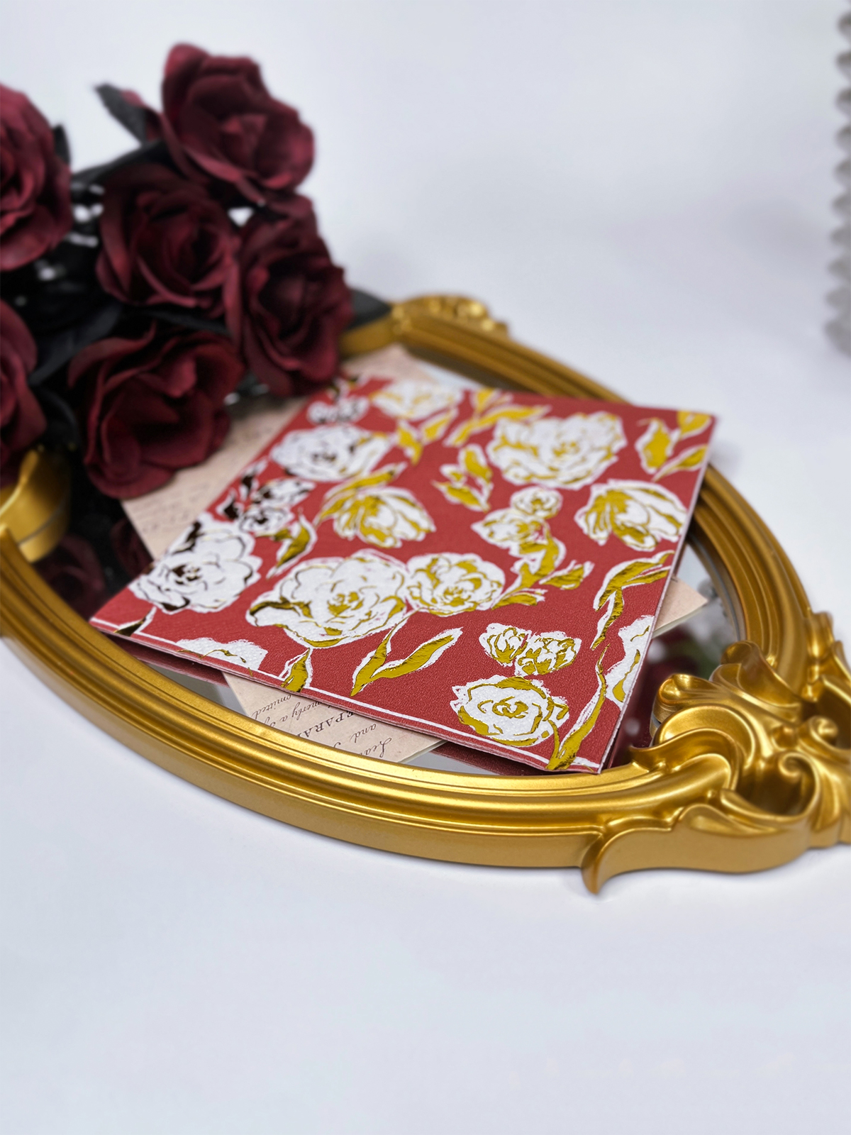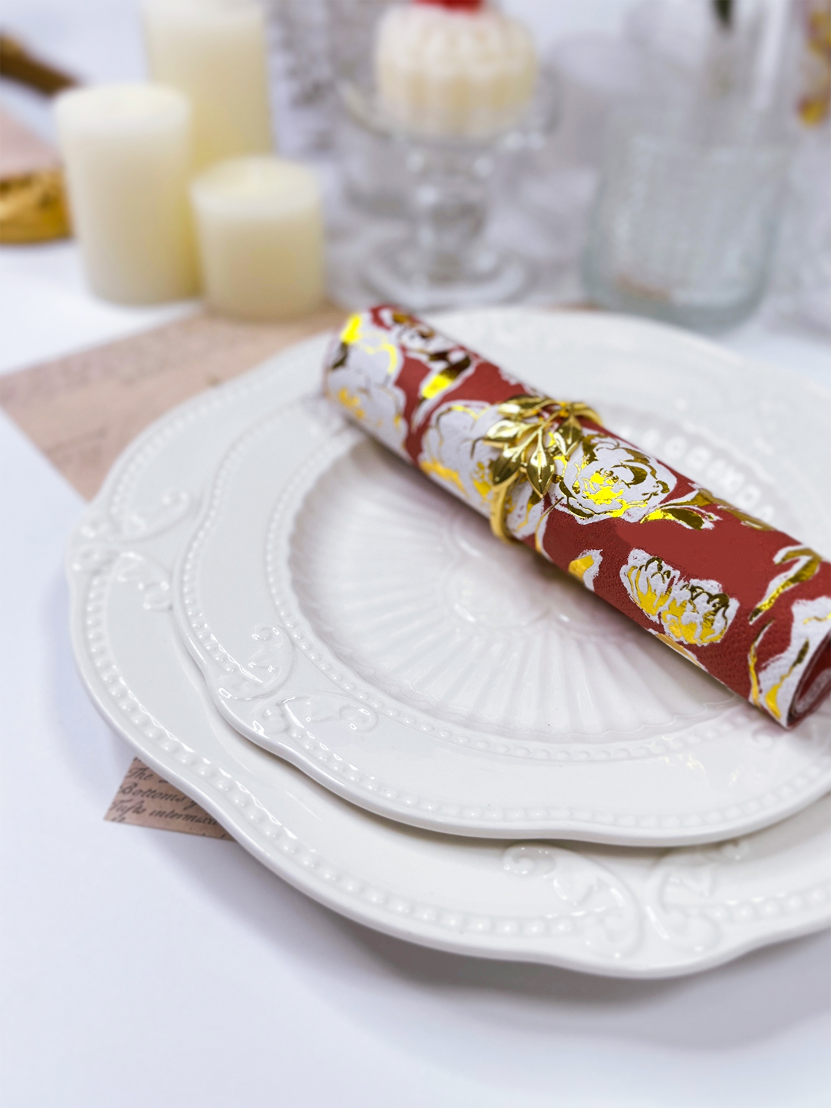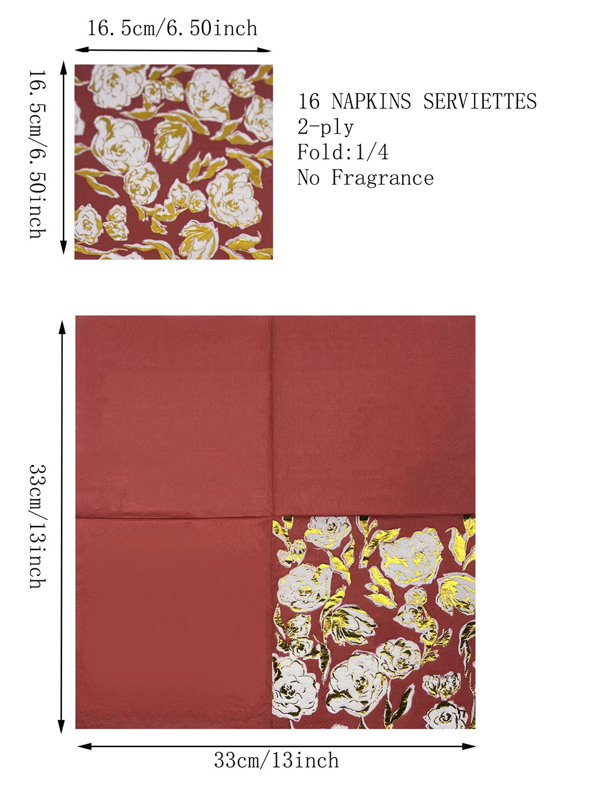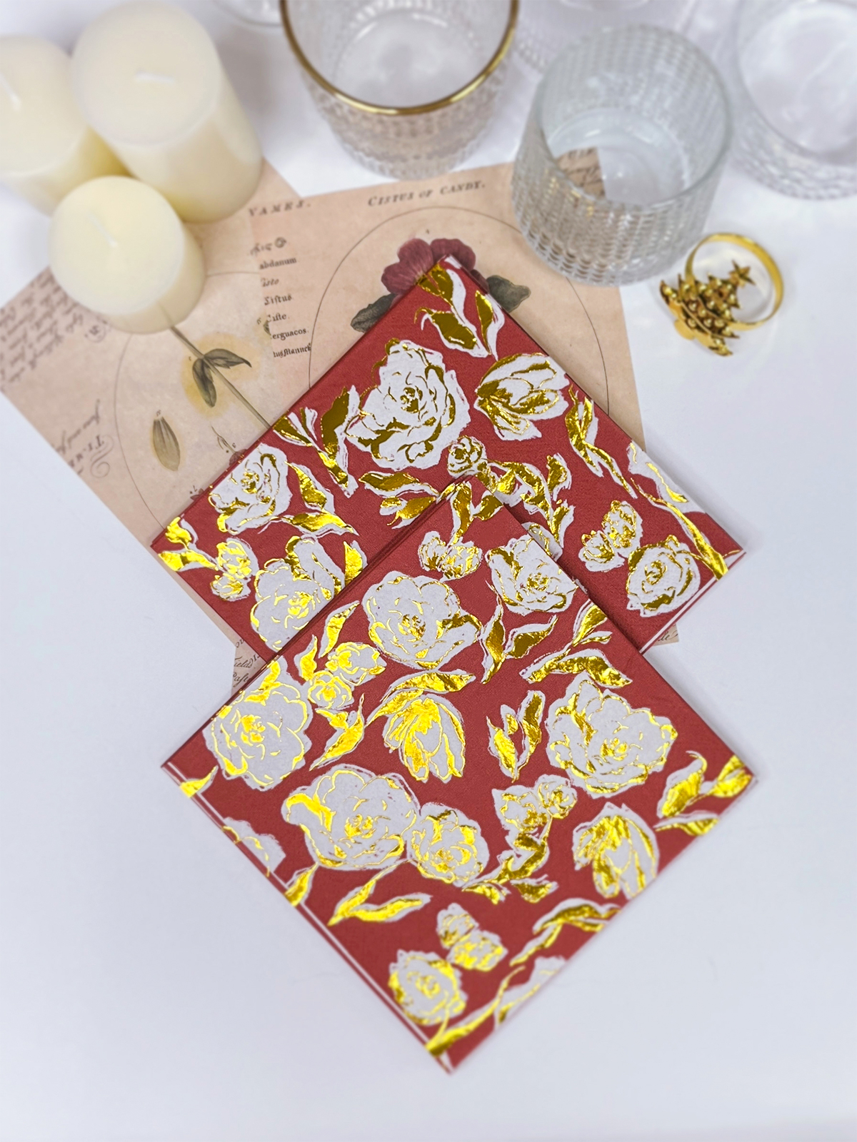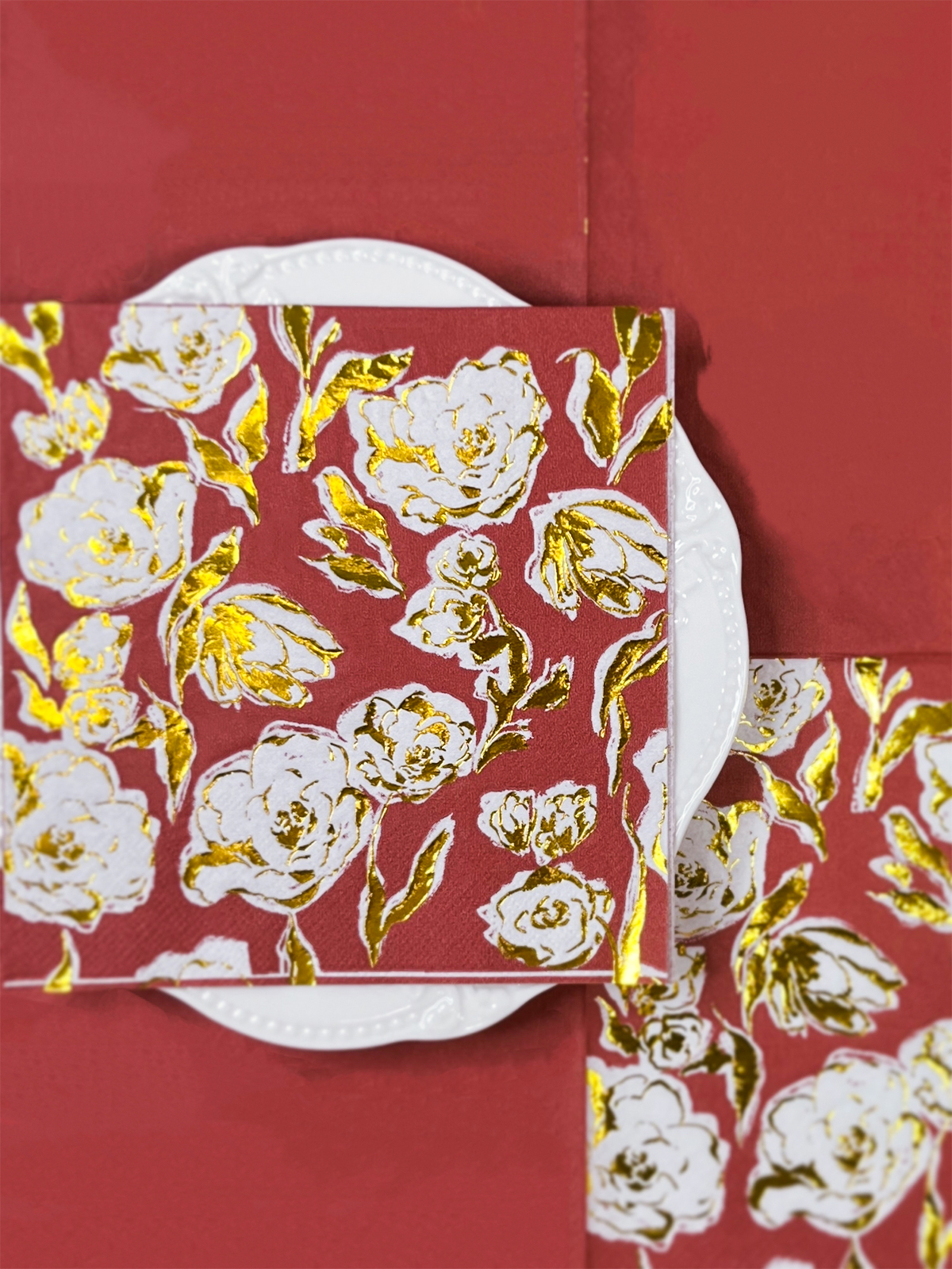 Os guardanapos de almoço são delicadamente desenhados com flores em folha de ouro sobre fundo vermelho, adicionando um toque de elegância aos seus eventos. Eles são atraentes e visualmente atraentes.